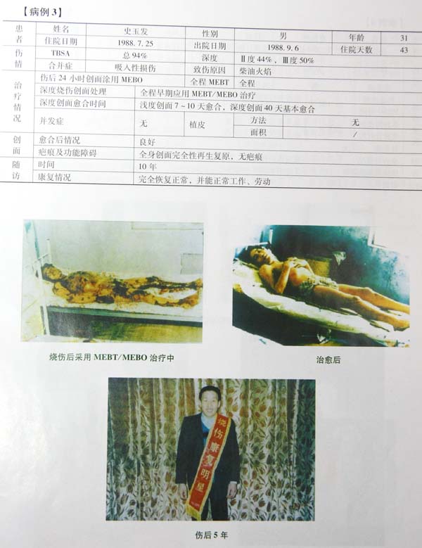 中國中西醫(yī)結(jié)合學(xué)會燒傷專業(yè)委員會全國醫(yī)療網(wǎng)廣大醫(yī)護(hù)人員應(yīng)用燒傷皮膚原位再生技術(shù)成功救治了大量的重癥燒傷患者,在歷次全國燒傷創(chuàng)瘍學(xué)術(shù)會議上,經(jīng)過專家委員會評審,已經(jīng)有100名經(jīng)治醫(yī)師獲得“全國燒傷康復(fù)明星獎”,以下展示的是部分獲得獎勵的大面積重癥燒傷患者應(yīng)用燒傷皮膚原位再生技術(shù)治療前、治療中和康復(fù)后的圖片和病例資料。