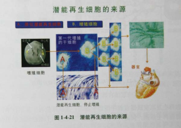 潛能再生細胞是與組織細胞在一起的、有潛能的、靜態(tài)的、原位性的和有干細胞再生功能的成體細胞(圖1-4-21)。