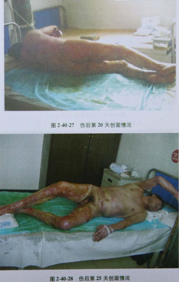 [病例2]患者陳××,男,55歲,江蘇省鹽城市射陽(yáng)縣耦耕鎮(zhèn)解放村7組,浴室鍋爐工,因沸水燙傷周身3小時(shí)急診入院?;颊哂?005年5月28日中午,因工作時(shí)不慎滑入浴室沸水池內(nèi),掙扎3次約10秒鐘才從池中爬出,在就近一家醫(yī)院予以中藥油紗布包扎,并輸液治療(具體用藥不詳),3小時(shí)后轉(zhuǎn)入我院,途中訴口渴、無(wú)小便。入院體檢體溫355℃,心率110次/分,呼吸32次/分,血壓70/40mmHg,神志尚清,精神緊張,煩躁,呼吸稍急促,四肢厥冷,兩肺呼吸音粗,未聞及干濕性啰音,心率110次/分,律齊,未聞及明顯雜音,全身紗布包扎,打開(kāi)敷料,見(jiàn)約有90%TBSA皮膚燙傷,創(chuàng)面有大小不等水皰多處,部分腐皮撕脫、皺折,創(chuàng)面基底紅白相間,以白為主,雙下肢創(chuàng)面呈蒼白色,痛覺(jué)遲鈍,皮溫涼。入院診斷:①沸水全身燙傷Ⅱ—Ⅲ度總面積90%TBSA(淺Ⅱ度20%,深Ⅱ度淺30%,深Ⅱ度深15%,Ⅲ度淺型25%);②休克。入院后病房室溫控制在28~30℃,相對(duì)濕度60%左右。立即予以吸氧,迅速建立靜脈補(bǔ)液通道,快速補(bǔ)液抗休克,補(bǔ)液原則參照燒傷皮膚原位再生技術(shù)抗休克補(bǔ)液公式,膠晶比例為1∶2左右,適當(dāng)調(diào)整輸液速度,將尿量控制在50~80mL/h。同時(shí)給予預(yù)防性應(yīng)用頭孢他啶防治感染,并應(yīng)用甘露醇,碳酸氫鈉,利尿合劑,雷尼替丁,毛花甙丙、多巴胺、654-2等藥物,以保護(hù)各臟器的功能。在作全身治療的同時(shí)簡(jiǎn)單清創(chuàng),去除卷曲、皺折腐皮,低位剪破水皰引流,保留皰皮,Ⅲ度淺型創(chuàng)面行“耕耘減張療法”,以“不麻醉、不疼痛、不出血”為原則,然后創(chuàng)面外涂MEBO,厚度約1mm。查血常規(guī)(5月28日)RBC 672×1012/L,HGB 218g/L,WBC 386×109/L,N 85%,L 11%,M 4%,PLT 362×109/L,血型B型,尿常規(guī)正常,糞常規(guī)正常。