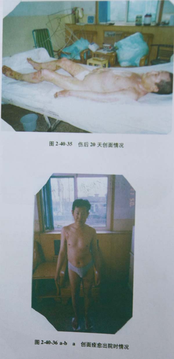 [病例3]患者賈××,36歲,石家莊市尼龍廠工人,住院日期200494日,出院日期20041130日,患者于工作中不慎從五米高處摔下,跌入電石爐中,造成全身堿燒傷,急入石家莊井陘礦務(wù)局醫(yī)院就診。入院診斷工業(yè)堿水全身Ⅱ—Ⅲ度燒傷總面積達(dá)92%TBSA(淺Ⅱ度40%,深Ⅱ度27%,Ⅲ度淺型10%,Ⅲ度深型15%)。即刻采用美寶濕潤燒傷膏外涂保護創(chuàng)面,同時采取全身系統(tǒng)治療。包括強心、抗休克、抗感染、保肝、保腎、保護胃腸黏膜、持保水、電解質(zhì)平衡和酸堿平衡、營養(yǎng)支持等綜合搶救措施,創(chuàng)面全程規(guī)范應(yīng)用燒傷皮膚原位再生技術(shù)和專用藥品美寶濕潤燒傷膏。患者于入院后24小時,發(fā)生全身侵襲性感染,血常規(guī)WBC13×109/L下降到5×109/L、PLT147×109/L下降到8×109/L;肝功 谷丙轉(zhuǎn)氨酶高達(dá)362U/L,精神差,腹脹明顯,體溫395℃,呼吸淺快,36/分。心率快,134/分。口唇紫紺,創(chuàng)面灰暗,并見片狀出血點,考慮為膿毒癥及并發(fā)肝、心等臟器功能不全。當(dāng)即給予高效、足量抗生素控制感染,加強心腦肝腎等臟器的支持保護,對創(chuàng)面進行徹底清理換藥。