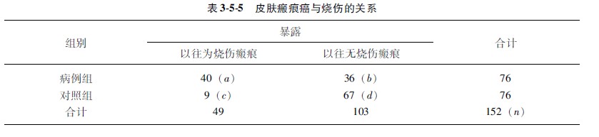 2比數(shù)比的假設(shè)檢驗(yàn):當(dāng)OR=1時(shí),認(rèn)為瘢痕癌與燒傷瘢痕無(wú)關(guān)聯(lián)。