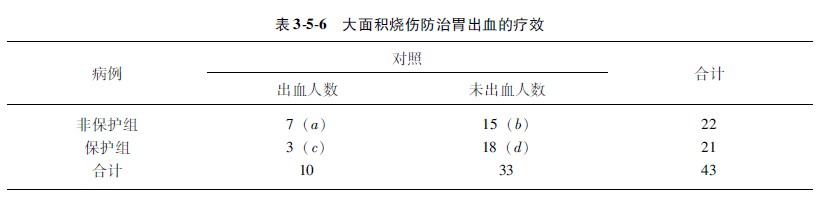示例354某醫(yī)生研究大面積燒傷采用“胃腸黏膜保護(hù)劑”預(yù)防胃出血的作用,資料匯于表356中。問(wèn)大面積燒傷病人不用“胃腸黏膜保護(hù)劑”進(jìn)行預(yù)防治療,是否是大面積燒傷病人發(fā)生胃出血的危險(xiǎn)因素?