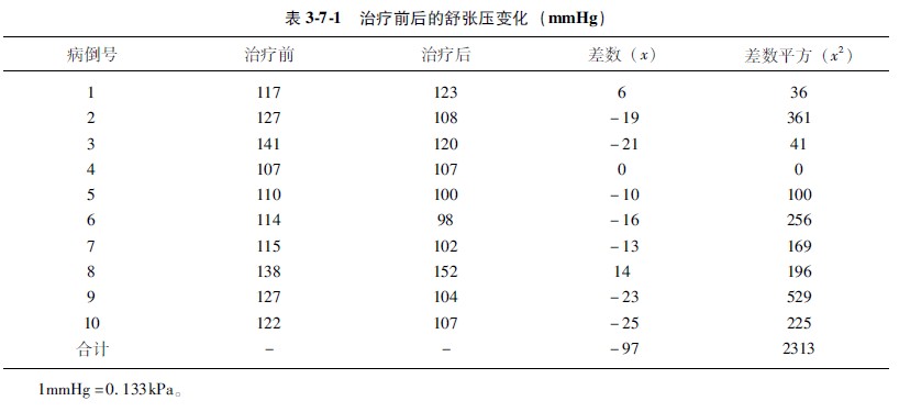 示例37410例高血壓病人采用A種降壓藥物治療,治療前后的舒張壓變化結(jié)果記錄于表371中。問A種降壓藥物治療后的舒張壓變化與治療前有無顯著性差異?