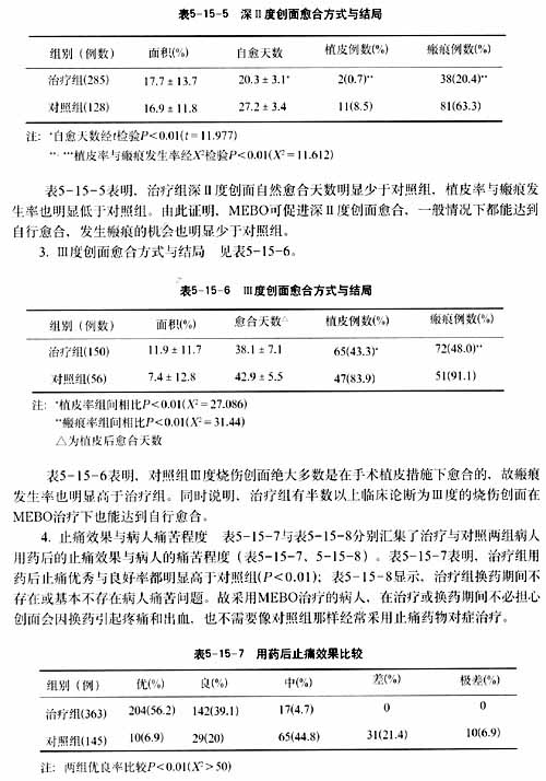 7. 大面積燒傷病人的療效 本研究508例病人中,以傷情分類標(biāo)準(zhǔn)(見表5-15-3)劃分,總燒傷面積大于50%TBSA的大面積燒傷病人共106例,占總病例數(shù)的20.9%,其中治療組75例,占大面積燒傷病人的70.8%(75/106),他們中一例最大燒傷面積達(dá)94%TBSA,同時(shí)III度面積達(dá)73%TBSA,如此嚴(yán)重?zé)齻∪藝?guó)內(nèi)治愈者是屈指可數(shù)的。對(duì)照組大面積燒傷31例,占大面積燒傷總例數(shù)的29.2%(31/106)。然而,兩組病人的治療效果截然不同。對(duì)照組死亡2例,最終因留有大于5%TBSA殘余創(chuàng)面而判為好轉(zhuǎn)者18例,因此對(duì)照組的治愈率僅為73.7%,好轉(zhuǎn)率為24.0%,死亡率為2.3%;而治療組全部治愈。同時(shí)指出,對(duì)照組有近半數(shù)病人由于SD-Ag療法效果欠佳而中途改用了MEBO治療。據(jù)此又可說明,對(duì)照組能有73.3%的治愈率,與MEBO能補(bǔ)救SD-Ag的某些缺欠也有很大關(guān)系。治療組全身同時(shí)應(yīng)用MEBO治療的創(chuàng)面面積已遠(yuǎn)遠(yuǎn)超過人體總面積的50%,而且是全程治療,且未發(fā)現(xiàn)病人有任何不良反應(yīng),說明MEBO在大面積燒傷病人中應(yīng)用是安全的。