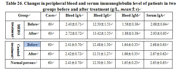 (5) Patients treated with MEBO had higher peripheral blood and serum immunoglobulin levels higher than before MEBO treatment and also higher levels than patients treated with non-MEBO method (P<0.05). MEBO significantly promoted immunity.