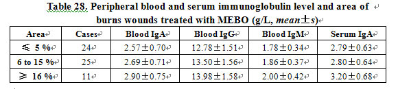 The larger the burns wounds treated with MEBO, the higher the level of peripheral blood and serum Ig, but no statistical difference (P>0.05). MEBO enhanced the immunity of peripheral blood and serum of patients with different burns areas (Table 28). Statistical analysis is shown in tables 29 and 30.