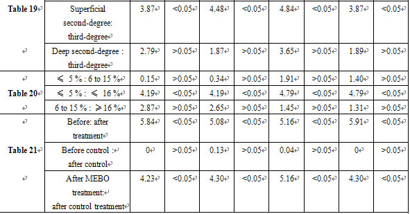 In the MEBO group, burns wounds with different depths had shorter healing time than those in the control group (P<0.01; Table 17). Only one case (1.7 %) in the MEBO group had wound infection, compared to 9 cases (15 %) in the control group. The difference between the two groups was significant (2=5.35, P<0.05). MEBO was proved to have infection-controlling and healing-promoting effects.