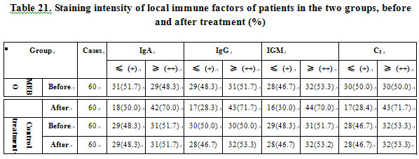 There was no significant correlation between staining intensity of local IgA-, IgG-, ad IgM-producing cells and C3, and the duration of MEBO treatment (P>0.05). The immunity of the patients was enhanced, irrespective of the duration of the treatment (Table 22).