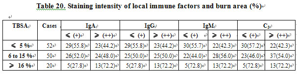 IgA-, IgG-, and IgM-producing cells and C3 in the burns area had higher staining intensity compared to those of the non-burns area and to those of normal persons (P<0.01). The immunity of the local area changed postburn. Immunologic function and reaction were enhanced. In the non-burns area, the immunity was similar to that of normal persons. The difference was not marked (P>0.05; Table 18).