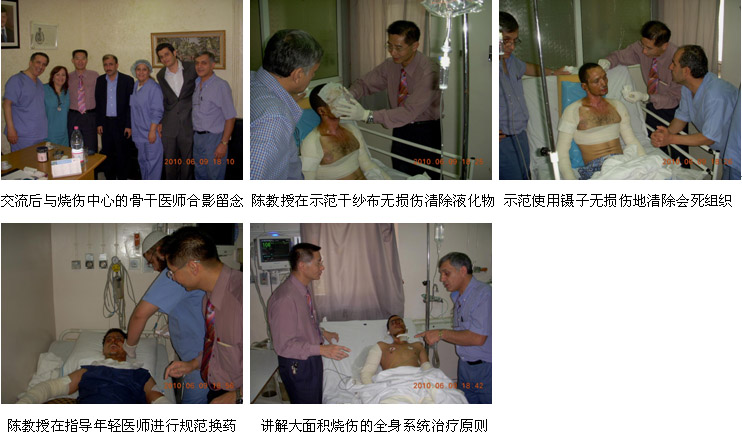 3、2010年6月10日上午,陳教授應(yīng)邀到約旦大學(xué)醫(yī)院(約旦最大的醫(yī)院,650病床)的燒傷中心(8張病床)進(jìn)行學(xué)術(shù)交流和指導(dǎo)。燒傷中心主任兼急診科主任Dr. Samir Jabaiti 教授熱情接待了陳教授一行,Dr. Samir教授首先帶領(lǐng)陳教授參觀考察了燒傷中心和急診科,并詳細(xì)介紹了燒傷再生醫(yī)學(xué)技術(shù)在醫(yī)院燒傷中心和急診科的應(yīng)用情況,在參觀急診科的過(guò)程中剛好有一個(gè)頭面部和雙上肢燒傷的急診患者,Dr. Samir指揮值班醫(yī)師馬上使用燒傷再生醫(yī)學(xué)技術(shù)和MEBO治療創(chuàng)面,患者接受治療后感到很滿意。隨后,陳教授應(yīng)邀到Dr. Samir的辦公室進(jìn)行了長(zhǎng)達(dá)1個(gè)半小時(shí)的學(xué)術(shù)交流,陳教授細(xì)心地解答了該院在應(yīng)用再生醫(yī)學(xué)技術(shù)治療深度燒傷的問(wèn)題、預(yù)防和控制感染的問(wèn)題、大面積燒傷的抗休克問(wèn)題、門診病人的家庭治療問(wèn)題等。由于該院是醫(yī)科大學(xué)教學(xué)醫(yī)院,因此還重點(diǎn)討論了下階段的臨床科學(xué)研究的命題、設(shè)計(jì)和具體的計(jì)劃等。交流討論在非常熱烈、和諧的氛圍中進(jìn)行,Dr. Samir多次說(shuō)到:“真是相見很晚!”,如果能夠早些見面,現(xiàn)在有很多的臨床研究工作都應(yīng)該出成果了。他希望雙方保持密切的聯(lián)系,共同醫(yī)治病人和合作完成臨床科研工作。
