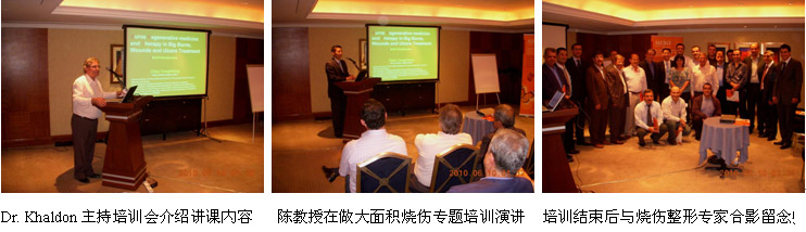 2.2010年6月9日晚上,約旦全國(guó)燒傷再生醫(yī)學(xué)培訓(xùn)與交流會(huì)在Iemeridien Hotel 的會(huì)議室召開,來(lái)自全國(guó)的22名燒傷整形醫(yī)師(全國(guó)總共有25名燒傷整形醫(yī)師)和1名來(lái)自鄰國(guó)巴勒斯坦的燒傷整形醫(yī)師參加了這次培訓(xùn)會(huì)議。培訓(xùn)會(huì)議由約旦燒傷整形外科學(xué)會(huì)的秘書、約旦軍隊(duì)醫(yī)療服務(wù)中心主任Dr. khaldon Hadadien 主持,陳教授以“Burns Regenerative Medicine and Therapy in Big Burn Treatment”(燒傷再生醫(yī)學(xué)與療法治療大面積燒傷)為題目,向各位燒傷整形外科專家介紹了燒傷再生醫(yī)學(xué)在深度燒傷皮膚原位再生機(jī)理、創(chuàng)面治療規(guī)范和全身系統(tǒng)治療原則等,陳教授在講解中結(jié)合自己的臨床實(shí)踐經(jīng)驗(yàn)和體會(huì),并以具體的臨床實(shí)際病例為教學(xué)案例深入淺出地講解,內(nèi)容豐富、新穎,通俗易懂,很受各位專家的歡迎。
