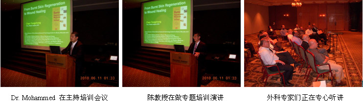 4、2010年6月11日晚上,約旦再生醫(yī)學(xué)外科醫(yī)師培訓(xùn)班在Sheraton Hotel的會(huì)議室召開,來(lái)自約旦首都各主要醫(yī)院的20多名普通外科、骨科和皮膚科專家參加了培訓(xùn)會(huì)。會(huì)議有約旦的國(guó)家經(jīng)理Dr. Mohammed Elayyan主持,陳教授應(yīng)邀以“From Burnt Skin Regeneration to Wound Healing”(從燒傷皮膚再生到創(chuàng)面愈合)為題,向參會(huì)的各位外科專家介紹了燒傷再生醫(yī)學(xué)的皮膚組織的再生機(jī)理和在各種嚴(yán)重的急性創(chuàng)傷和慢性可以的臨床治療經(jīng)驗(yàn)和具體的臨床治療方法,大家聽后很受啟發(fā),受益匪淺,培訓(xùn)效果較理想。