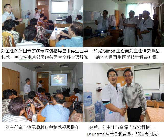 2012-9-17---2012-9-23日,為了進一步了解和學習燒傷再生醫(yī)學在中國臨床上的應用,來自印度尼西亞、馬來西亞和蒙古3個國家的醫(yī)生一行8人 在美寶國際市場集團和印尼代理商Arif hamsah等多方前期制定的計劃安排下,齊聚廣州中西醫(yī)結合醫(yī)院參觀學習美寶再生醫(yī)學技術,受到了醫(yī)院院長以及科室主任和醫(yī)生們熱烈歡迎。