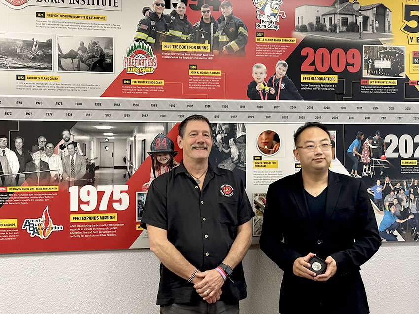 該研究所執(zhí)行董事Joe Pick熱情接待徐鵬主席一行并介紹了FFBI的歷史及使命。FFBI是一家創(chuàng)建了50年的非營(yíng)利機(jī)構(gòu),專注于燒傷患者治療后的身心康復(fù)和生活質(zhì)量提高,以及火災(zāi)預(yù)防科普及教育。徐鵬主席則具體介紹了美寶國(guó)際與薩克拉門托國(guó)王隊(duì)在表彰消防員方面的合作以及與UC Davis燒傷研究所在燒傷治療FDA臨床研究領(lǐng)域的合作,并介紹了與美國(guó)燒傷學(xué)會(huì)(ABA)合作的Empathy Museum 項(xiàng)目,這一項(xiàng)目通過(guò)對(duì)傳統(tǒng)燒傷治療造成的副作用及后遺癥對(duì)患者傷后生活的嚴(yán)重影響的展示,呼吁預(yù)防燒傷及更優(yōu)質(zhì)的燒傷技術(shù)的普及。