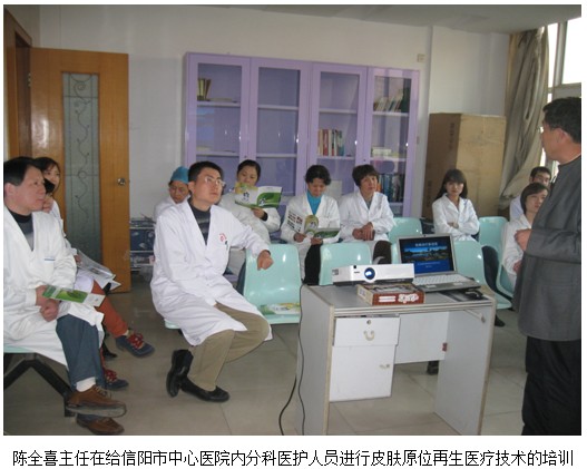 2012年11月18日,中國中西醫(yī)結(jié)合學(xué)會(huì)燒傷專業(yè)委員會(huì)委員、北京美寶燒傷創(chuàng)瘍研究所臨床部專家陳全喜主任受信陽市中心醫(yī)院內(nèi)分泌科主任郭向陽的邀請(qǐng)和區(qū)域經(jīng)理李瑩瑩一同到信陽市中心醫(yī)院內(nèi)分泌科進(jìn)行全科人員的皮膚原位再生醫(yī)療技術(shù)的培訓(xùn)。