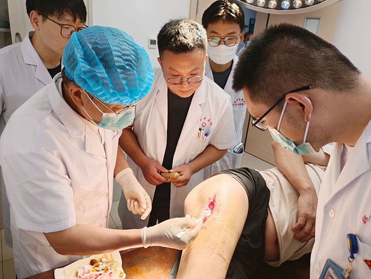 8月18日,應(yīng)河北魏縣中醫(yī)醫(yī)院之邀,再生醫(yī)學(xué)知名專家、《中國(guó)燒傷創(chuàng)瘍雜志》常務(wù)編委趙瑞慶主任,在該院會(huì)診了三例創(chuàng)面患者(下肢外傷皮膚深部感染、腦出血合併巨大壓瘡、肢體多部位瀝青燒傷),并親自演示了操作程序,在討論環(huán)節(jié)提供了一對(duì)一的治療方法。