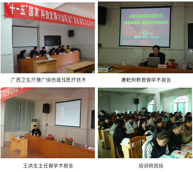 當(dāng)日上午9:30分,開幕式結(jié)束后,適宜技術(shù)培訓(xùn)班正式開始,王洪生研究員應(yīng)邀首先以“燒傷濕性醫(yī)療技術(shù)臨床規(guī)范化應(yīng)用和再生療法在難治性創(chuàng)瘍治療新進(jìn)展”進(jìn)行了專題臨床學(xué)術(shù)講座;接下來,中國中西醫(yī)結(jié)合學(xué)會燒傷專委會副主任委員、廣西中西醫(yī)結(jié)合學(xué)會燒傷分會主委、廣西中醫(yī)學(xué)院科技處處長、“十一五”國家科技支撐計(jì)劃項(xiàng)目燒傷濕性醫(yī)療技術(shù)臨床規(guī)范化應(yīng)用等5項(xiàng)適宜技術(shù)課題負(fù)責(zé)人唐乾利教授,做了“規(guī)范燒傷濕性醫(yī)療技術(shù)的臨床應(yīng)用,預(yù)防醫(yī)療糾紛發(fā)生”的專題講座。燒傷濕性醫(yī)療技術(shù)研究方向的碩士研究生趙乙飛、任文東等對金秀縣人民醫(yī)院桐木分院、金秀縣瑤醫(yī)院的燒傷、創(chuàng)瘍病人進(jìn)行了現(xiàn)場技術(shù)指導(dǎo)。