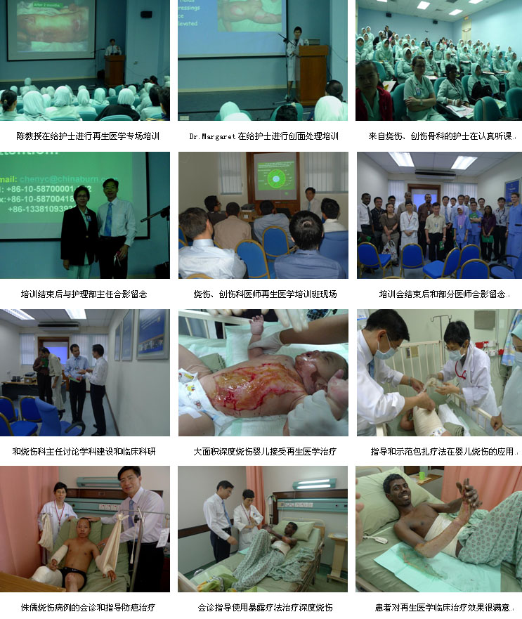 醫(yī)院,800多病床)的燒傷中心建設(shè)、醫(yī)護(hù)人員培訓(xùn)、臨床病例的會診救治、媒體宣傳的組織策劃等工作均收效顯著。這次對重點(diǎn)醫(yī)院的技術(shù)支持和幫助,主要是針對新成立燒傷中心后的進(jìn)一步規(guī)范燒傷再生醫(yī)學(xué)技術(shù)在該中心的應(yīng)用而安排的,中國燒傷創(chuàng)瘍科技中心臨床部主任、北京榮祥再生醫(yī)學(xué)研究所副所長陳永翀教授承擔(dān)了這次技術(shù)支持任務(wù),同時(shí)燒傷中心主任Dr. Salina 結(jié)合自己的經(jīng)驗(yàn)和陳教授積極配合,對全科的16名醫(yī)護(hù)人員進(jìn)行了較系統(tǒng)和全面的燒傷、創(chuàng)瘍和疤痕治療的再生醫(yī)學(xué)技術(shù)培訓(xùn)、病例討論、會診指導(dǎo)和現(xiàn)場示范等。期間,陳教授還約見了醫(yī)院的院長Dr. Khalid Ibrahim,介紹了徐榮祥教授發(fā)明創(chuàng)立的燒傷再生醫(yī)學(xué)技術(shù)的特點(diǎn)與臨床應(yīng)用的真實(shí)效果,以及陳教授在中國和部分國外的國家,利用燒傷再生醫(yī)學(xué)的技術(shù)優(yōu)勢,幫助多家醫(yī)院成功建設(shè)發(fā)展燒傷中心的經(jīng)驗(yàn),與院長就下階段燒傷中心的建設(shè)與發(fā)展問題進(jìn)行了深入的研究和討論,確定了燒傷中心未來的發(fā)展方向和目標(biāo)。院長表示一定將國際領(lǐng)先的燒傷再生醫(yī)學(xué)技術(shù)作為燒傷中心發(fā)展的根本,全面支持燒傷中心的建設(shè)與發(fā)展。
