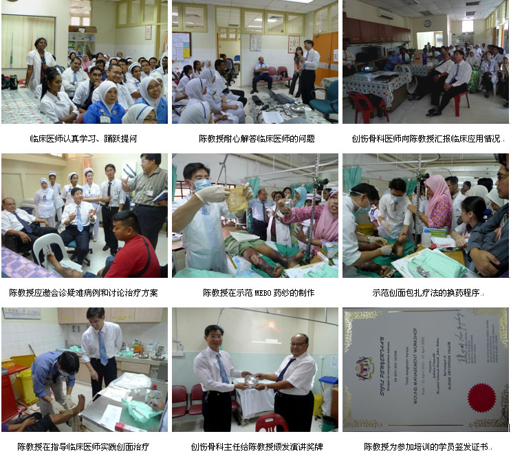 3、2010年4月14日和4月20日,馬來亞大學(xué)醫(yī)院再生醫(yī)學(xué)技術(shù)外科護(hù)士和燒傷整形科醫(yī)師培訓(xùn)班分別在醫(yī)院的階梯教室和外科教研室舉辦,護(hù)士培訓(xùn)班由醫(yī)院護(hù)理部主任Mrs.NG Mooi Eng主持,60多名來自外科系統(tǒng)的護(hù)士參加了培訓(xùn)班,而燒傷整形科醫(yī)師的培訓(xùn)班則由燒傷科主任Dr. Alizan主持,20多名燒傷整形科和創(chuàng)傷骨科醫(yī)師參加了培訓(xùn)班,培訓(xùn)班既有精彩的演講培訓(xùn),又有臨床病例示范,生動易懂,很受歡迎。培訓(xùn)班和臨床病例會診、示范結(jié)束后,陳教授在主任的帶領(lǐng)下,應(yīng)邀到大學(xué)實(shí)驗(yàn)室參觀和指導(dǎo)進(jìn)行臨床應(yīng)用研究等工作,聽了陳教授對以后科研工作的初步設(shè)計(jì)后,大家都非常興奮和激動,希望能夠盡快開展和完成臨床應(yīng)用研究,并將研究成果匯報(bào)給國家衛(wèi)生部,為將來該技術(shù)在馬來西亞的推廣應(yīng)用做準(zhǔn)備和打下科學(xué)基礎(chǔ)。這2次的培訓(xùn)班為進(jìn)一步規(guī)范該教學(xué)醫(yī)院的創(chuàng)面治療技術(shù)和提高燒傷病人的救治水平起到了積極和關(guān)鍵的作用。