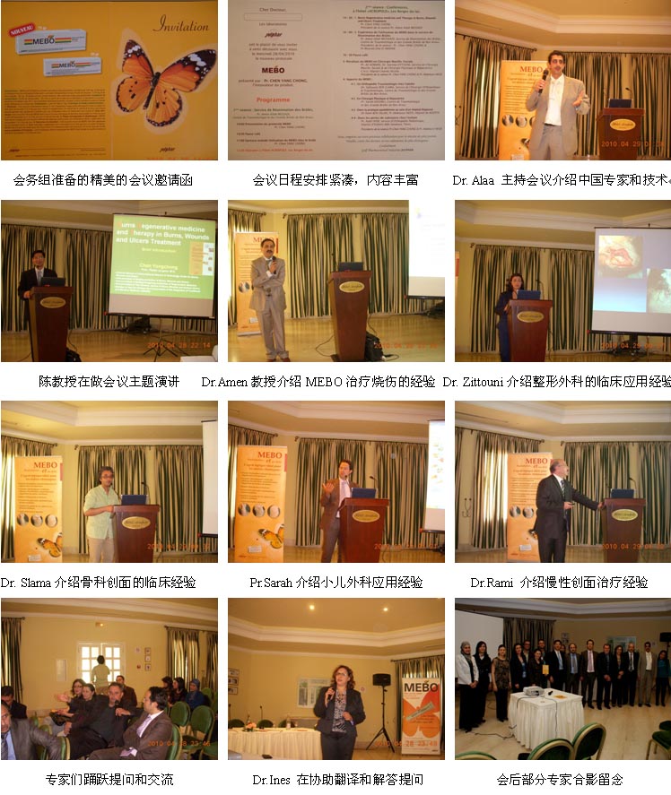 3、2010年4 月29日,突尼斯國(guó)家級(jí)燒傷、創(chuàng)傷外科學(xué)術(shù)交流會(huì)在Acropole Hotel會(huì)議室舉辦, 學(xué)術(shù)交流會(huì)有Dr.Alaa Haleil主持,來(lái)自全國(guó)3個(gè)主要城市的10多家醫(yī)院的30多名燒傷、整形、創(chuàng)傷外科醫(yī)師參加了學(xué)術(shù)交流會(huì),陳教授以“Burns Regenerative Medicine and Therapy in Burns, Wounds and Ulcers treatment” 為題做了主題演講。另外,還有6名專家教授在交流會(huì)上介紹了他們近年來(lái)應(yīng)用MEBO治療燒傷、創(chuàng)傷和潰瘍的臨床經(jīng)驗(yàn),學(xué)術(shù)氛圍濃厚,大家都覺(jué)得這是一次非常難得的交流和學(xué)習(xí)的機(jī)會(huì),希望以后每次學(xué)術(shù)年會(huì)都有新技術(shù)和好經(jīng)驗(yàn)的介紹和交流。