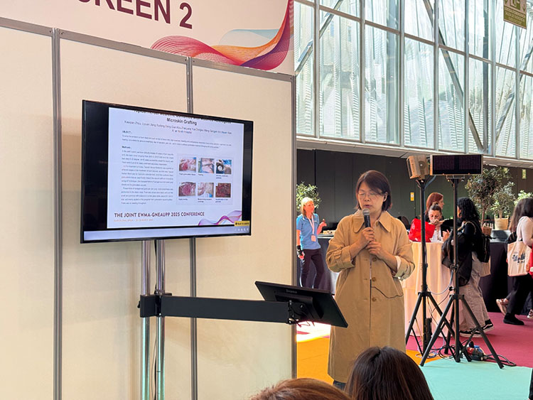 除展臺的展示外,再生醫(yī)療技術(shù)更是在會議中掀起一次次學(xué)術(shù)浪潮。大會首日下午,題為“重塑創(chuàng)面治療:從臨床實踐到技術(shù)創(chuàng)新”的再生醫(yī)療技術(shù)研討會順利召開。作為推動克林頓全球倡議(CGI)——“歐洲修復(fù)計劃:賦能歐洲再生醫(yī)療網(wǎng)絡(luò)構(gòu)建”的又一關(guān)鍵活動,研討會圍繞再生醫(yī)療技術(shù)在急慢性創(chuàng)面中的創(chuàng)新應(yīng)用展開討論。來自沙特 Sulaiman Al Habib醫(yī)療集團外科的Ziad Dalloul首先分享了馬喬林潰瘍的臨床管理策略,深入探討了再生醫(yī)療技術(shù)在復(fù)雜創(chuàng)面中的應(yīng)用及優(yōu)勢。隨后,西安市第九醫(yī)院燒傷整形科周小茜帶來了應(yīng)用自創(chuàng)微粒皮漿種植結(jié)合再生醫(yī)療技術(shù)治療慢性創(chuàng)面的演講,充分展示了該技術(shù)在促進慢性創(chuàng)面愈合中的優(yōu)勢。最后,來自菲律賓Quirino Memorial醫(yī)療中心燒傷科的Nikki Valencia分享了一項最新的系統(tǒng)回顧,全面證實了再生醫(yī)療技術(shù)在燒傷治療中的綜合療效、安全性、疼痛緩解及感染預(yù)防方面的顯著療效。