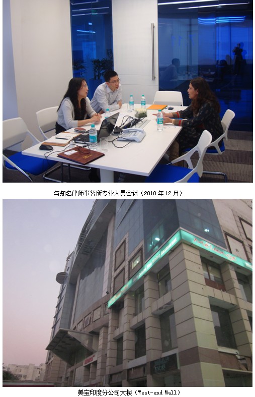 2010年下半年,國際市場集團市場部印度工作小組對印度外資投資政策、醫(yī)藥行業(yè)的特殊要求、公司組建細節(jié)與程序、公司運營、稅務(wù)、審計等進行了深入的研究和評估,并初步確定了美寶印度分公司的組建與運營初步計劃。經(jīng)董事局批準,2011年2月正式全面啟動美寶印度分公司項目,在我方的積極努力下,與NEERAJ CO簽訂了公司注冊代理協(xié)議并啟動了MEBO Pharmaceutical (India) Pvt Ltd 在印度新德里的全面注冊工作,公司目前已經(jīng)擁有營業(yè)執(zhí)照、自由進出口證書以及藥品經(jīng)營證書等相關(guān)證書,為全面運營打下了堅實基礎(chǔ)。