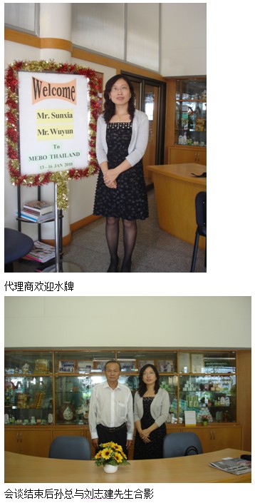 1月14日,孫總與泰國(guó)代理商劉志建先生于MEBO(Thailand)公司就泰國(guó)美寶市場(chǎng)拓展規(guī)劃進(jìn)行了親切的商務(wù)會(huì)談。雙方回顧了美寶泰國(guó)的發(fā)展歷程,劉先生深情地介紹了早年協(xié)助發(fā)展美寶的艱辛經(jīng)歷,美寶燒傷膏是泰國(guó)第一個(gè)正式注冊(cè)的中國(guó)藥品,這是美寶的驕傲,也是中國(guó)的驕傲。近幾年祖國(guó)的強(qiáng)大使所有的海外華人興奮不已,談到動(dòng)情處時(shí),擁有濃濃愛(ài)國(guó)熱情的劉先生幾度熱淚盈眶。與此同時(shí),雙方深入地分析了多年來(lái)泰國(guó)美寶發(fā)展緩慢的狀況,并確定了下一步總體發(fā)展的發(fā)向和思路。此次高層會(huì)晤進(jìn)一步提升代理商對(duì)美寶總體海外規(guī)劃及技術(shù)產(chǎn)品的高度認(rèn)可和理解,在技術(shù)產(chǎn)品發(fā)展理念、經(jīng)銷(xiāo)商經(jīng)營(yíng)掌控等方面達(dá)成了多項(xiàng)共識(shí)。