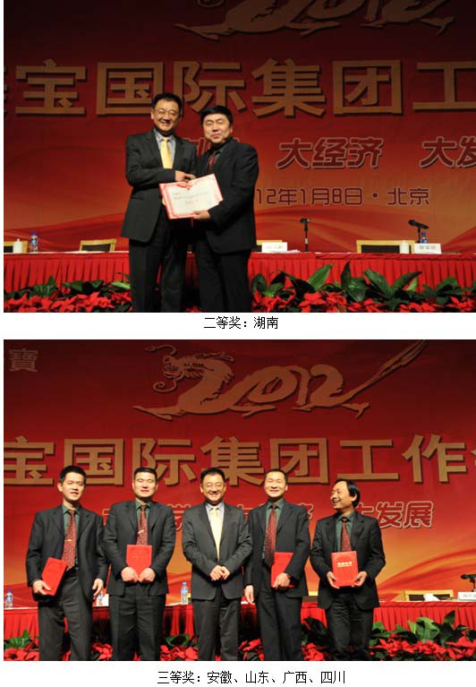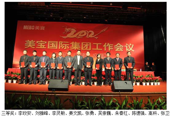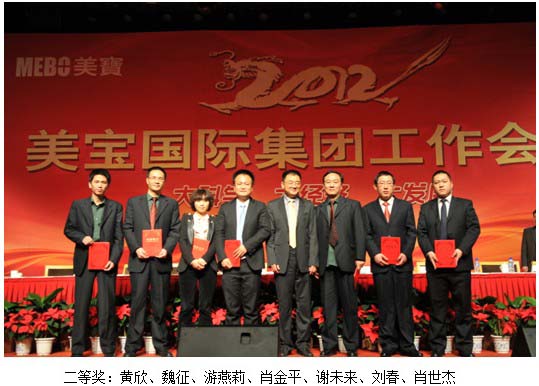美寶燒傷創(chuàng)瘍集團(tuán)2011年度市場經(jīng)營業(yè)績表彰大會于2012年1月8日14:00在長安大飯店拉開帷幕。這次會議由燒傷創(chuàng)瘍集團(tuán)副總裁張坤主持,出席會議的有美寶國際集團(tuán)董事局主席徐榮祥、燒傷創(chuàng)瘍集團(tuán)總裁楊智斌及燒傷創(chuàng)瘍集團(tuán)全體人員,并由徐榮祥主席親自為所有獲獎人員頒獎。