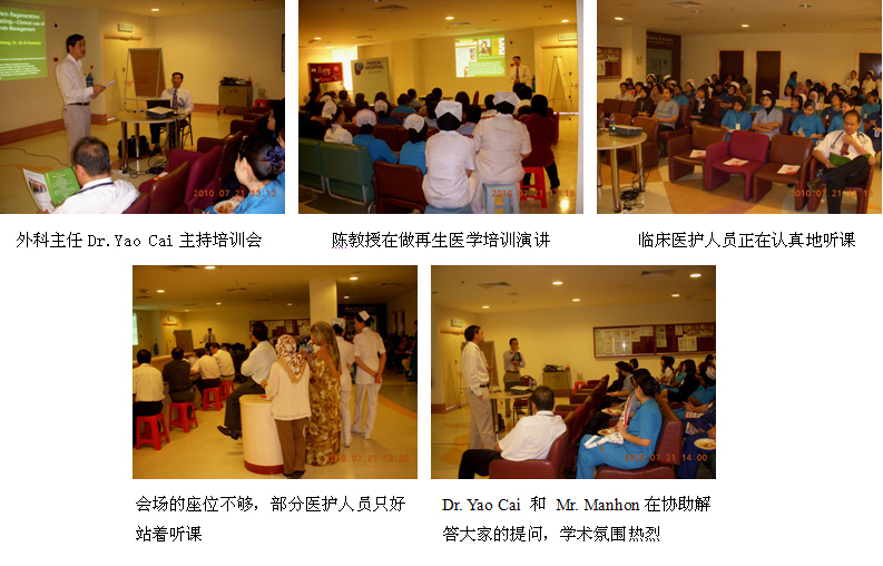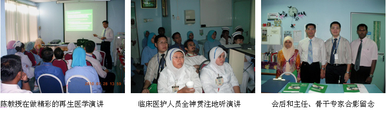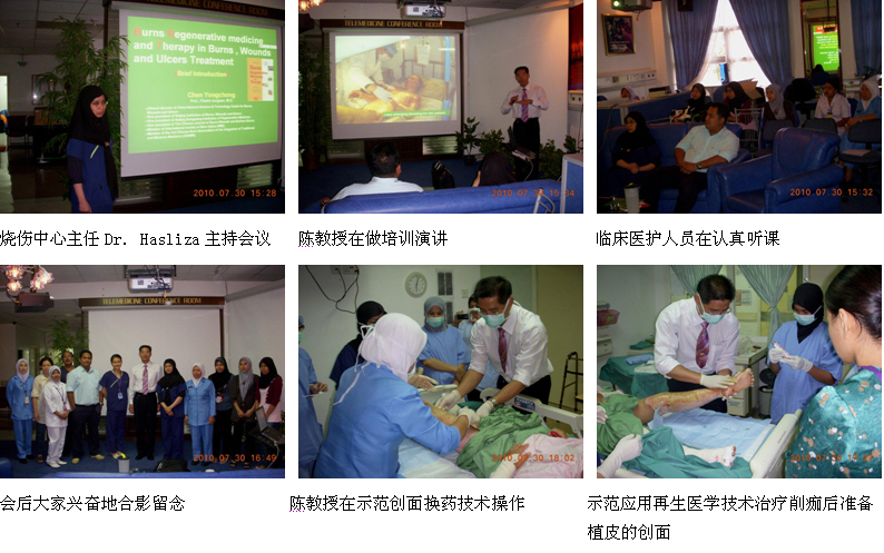 8、7月30日上午,陳教授應(yīng)邀到Hospital Selayang Dato Pathanan( 省政府醫(yī)院,也是當(dāng)?shù)刈畲蟮尼t(yī)院,450病床,燒傷中心有8張病床)介紹燒傷再生醫(yī)學(xué)技術(shù)并會診指導(dǎo)臨床病例。學(xué)術(shù)交流和現(xiàn)場指導(dǎo)后,該院馬上引進(jìn)和應(yīng)用再生醫(yī)學(xué)技術(shù)治療燒傷創(chuàng)瘍患者。1個月后隨訪獲知:采用再生醫(yī)學(xué)技術(shù)治療的患者獲得了很好的臨床效果,實(shí)現(xiàn)了新醫(yī)院的成功開發(fā)。