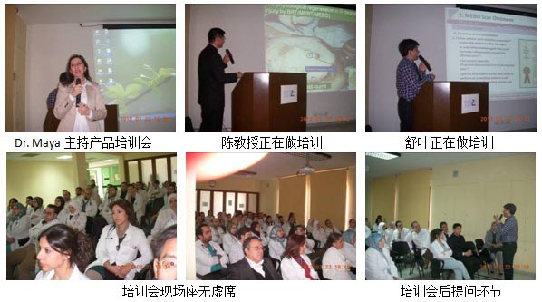 2. 2月23日早上10點(diǎn)半,美寶推廣團(tuán)隊(duì)再次來到賽達(dá)市,為當(dāng)?shù)匾患宜搅⒋髮W(xué)附屬醫(yī)院Hammoud Hospital的醫(yī)務(wù)人員進(jìn)行專門的疤痕軟膏培訓(xùn)。培訓(xùn)會(huì)由Dr. Maya主持,Dr. Maya是藥學(xué)的博士,現(xiàn)在負(fù)責(zé)美寶所有產(chǎn)品在黎巴嫩的經(jīng)營工作。醫(yī)院共計(jì)有60余名醫(yī)生、藥師、護(hù)士參加此次培訓(xùn)會(huì)。當(dāng)醫(yī)生們看到再生醫(yī)療技術(shù)及其配套產(chǎn)品在抗疤領(lǐng)域所取得驕人成績時(shí),詳細(xì)地詢問我們的產(chǎn)品和現(xiàn)在主流的產(chǎn)品硅膠貼有何不同等相關(guān)問題。負(fù)責(zé)產(chǎn)品推廣的舒葉解釋說,硅膠貼和疤痕平在抗疤的原理上有一小部分是相似的,那就是兩種產(chǎn)品都能保持創(chuàng)面的濕潤。但是硅膠貼使用合成的材料來保持創(chuàng)面濕潤,而疤痕平卻是用獨(dú)特的由天然成分蜂蠟和麻油組成的框架劑型來保持接近于正常皮膚水分丟失來保持創(chuàng)面濕潤,這是硅膠貼產(chǎn)品所不能比擬的;除此,疤痕軟膏中各種物質(zhì)能提供給細(xì)胞各種必需的營養(yǎng)成分,調(diào)節(jié)膠原蛋白正常生長,以此來達(dá)到預(yù)防和治療疤痕的效果。