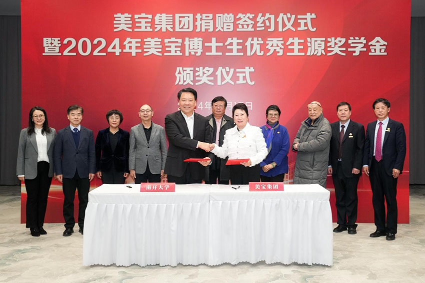 12 月 17 日,美寶集團(tuán)捐贈簽約儀式暨 2024 年美寶博士生優(yōu)秀生源獎學(xué)金頒獎儀式在南開大學(xué)海冰樓舉行。當(dāng)天,南開大學(xué)津南校區(qū)“榮祥樓”正式揭牌。