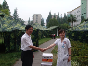6月10日中國抗震救災(zāi)創(chuàng)瘍專家醫(yī)療隊(duì)在會診病人的同時也再次代表醫(yī)療隊(duì)總指揮徐榮祥教授向醫(yī)院又捐贈了抗震救災(zāi)急需藥品美寶創(chuàng)瘍貼一箱、曲咪新一箱、濕潤燒傷膏一箱,以及慰問金。一方面中國抗震救災(zāi)創(chuàng)瘍專家醫(yī)療隊(duì)依然堅持在前線進(jìn)行抗震救災(zāi)傷員救治工作,另一方面力所能及地向?yàn)?zāi)區(qū)醫(yī)院進(jìn)行急需藥品、物質(zhì)支援。