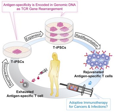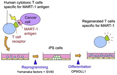 研究團(tuán)隊(duì)使用的技術(shù)引用了已知的因子(山中申彌使用的因子)將成熟的免疫T細(xì)胞轉(zhuǎn)化為iPSCs。然后擴(kuò)增這些iPSCs并使他們重新分化為T細(xì)胞。新生成的T細(xì)胞被還原(rejuvenate)后生長(zhǎng)潛能提高、壽命延長(zhǎng),且仍然具有最初的識(shí)別癌癥和艾滋病感染靶細(xì)胞的能力。這意味著用iPSCs技術(shù)調(diào)控T細(xì)胞可能幫助將來建立更有效的免疫療法。