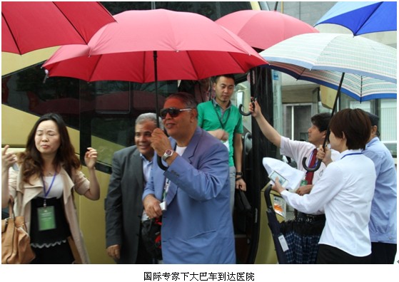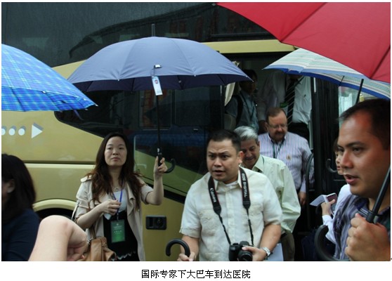 24日9時(shí)許,國(guó)際專家們乘坐大巴車到達(dá)南通市第三人民醫(yī)院,此時(shí)天上下起小雨,但專家們的參觀熱情依然高漲。