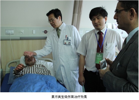 隨著院方引導(dǎo)員的指引,專家們來(lái)到了此次參觀的重點(diǎn)部分——燒創(chuàng)傷科室,在此接待的是燒傷科的趙主任。趙主任首先介紹了美寶再生產(chǎn)品在醫(yī)院的使用情況,隨后將專家們帶進(jìn)住院病房,分別通過(guò)一個(gè)燒傷病例和一個(gè)褥瘡病例展示了美寶產(chǎn)品在治療燒傷創(chuàng)瘍領(lǐng)域的獨(dú)特功效。第一個(gè)病例是一個(gè)深二度燒傷病人,趙主任展示了經(jīng)過(guò)一段時(shí)間美寶燒傷膏的使用病人的恢復(fù)情況,并現(xiàn)場(chǎng)對(duì)國(guó)際專家并行了美寶燒傷膏換藥的操作示范,使專家團(tuán)對(duì)美寶產(chǎn)品有了更加全面和更加深入的認(rèn)識(shí)。