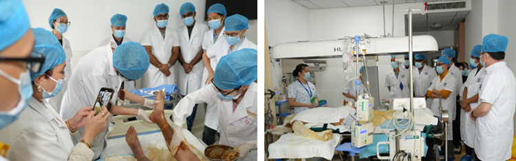 9月18日,代表團赴瀏陽市開展醫(yī)療交流,先后訪問了瀏陽市中醫(yī)院與瀏陽市人民醫(yī)院。兩家醫(yī)院在再生醫(yī)療技術(shù)臨床應用方面均擁有深厚積累,尤其在大面積燒傷綜合救治領(lǐng)域成效顯著。當日上午,代表團首先到訪瀏陽市中醫(yī)院,在燒傷科主任朱樹昌的陪同講解下,代表團實地了解到了翻身床、懸浮床、紅外線照射等設備在大面積燒傷治療中的輔助應用,并就中西醫(yī)結(jié)合模式在提升創(chuàng)面修復效果與患者滿意度方面的實踐路徑,進行了深入交流。下午,代表團轉(zhuǎn)赴瀏陽市人民醫(yī)院。周明亮院長結(jié)合典型病例,系統(tǒng)介紹了該院將大面積燒傷創(chuàng)面的治療經(jīng)驗轉(zhuǎn)化應用于慢性難愈合創(chuàng)面的臨床策略與關(guān)鍵技術(shù)。隨后,皮膚醫(yī)學中心主任蔣章佳與燒傷重建創(chuàng)面修復科主任焦獻功共同展示了獲專利認證的醫(yī)院自研設備——磨痂器及環(huán)鉆治療術(shù),借助臨床案例生動演示了該技術(shù)在處理大面積燒傷創(chuàng)面、慢性難愈合創(chuàng)面及瘢痕綜合管理中的顯著療效。訪問期間,代表團還與兩院醫(yī)護人員圍繞再生醫(yī)療技術(shù)的規(guī)范化實施、治療流程優(yōu)化及植皮手術(shù)操作要點等議題,開展了廣泛而專業(yè)的座談交流。
