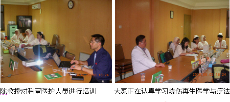 7、8月13日上午9時,由醫(yī)師學(xué)會主辦的Jambi市級燒傷再生醫(yī)學(xué)臨床培訓(xùn)班(省級繼續(xù)教育項目,學(xué)分6分)在Raden Mattaher hospital的學(xué)術(shù)報告廳里舉辦,來自全是主要的4家政府醫(yī)院和其它10多家私營醫(yī)院的80多名臨床醫(yī)師、護士參加了這次培訓(xùn)會。培訓(xùn)會由Raden Mattaher hospital副院長Dr.Imanuel主持,醫(yī)院大外科主任Dr. Aziz介紹了應(yīng)用MEBO治療褥瘡的臨床經(jīng)驗,陳教授則應(yīng)邀作了“燒傷再生醫(yī)學(xué)與療法在燒傷、創(chuàng)瘍疾病治療的臨床規(guī)范應(yīng)用”的培訓(xùn)演講,很受大家的歡迎,達(dá)到了較理想的培訓(xùn)效果。