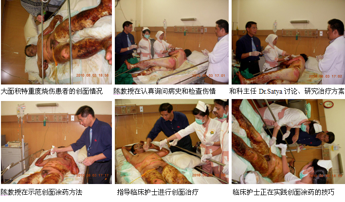 3、8月3日下午,陳教授一行完成了在Fatmawati hospital的培訓(xùn)任務(wù)后,馬上又應(yīng)邀到雅加達(dá)市的Harapan Bunda hospital會診、指導(dǎo)一例大面積特重度燒傷的患者。該患者是一名男性,47歲。因被火焰燒傷全身而入院。臨床診斷:1、大面積特重度燒傷(75%TBSA深I(lǐng)I度---深I(lǐng)II度);2、中度吸入性損傷。由于患者燒傷面積大、深度深,且是該院收治的第一例特重度燒傷患者,為了更好地使用燒傷再生醫(yī)學(xué)技術(shù)治療該患者,醫(yī)院特地邀請陳教授對該患者進行會診和指導(dǎo)。陳教授到了病房后首先聽取了病情匯報,然后認(rèn)真詢問了病史、查閱了病歷資料、護理記錄和進行了細(xì)致的體格檢查,并結(jié)合該病例的具體傷情和情況,提出了一整套具體的全身系統(tǒng)治療和創(chuàng)面治療方案。討論和制定了治療方案后,陳教授親自為大家示范了深度燒傷痂皮的耕耘減張技術(shù)和燒傷濕潤暴露療法的創(chuàng)面治療方法。