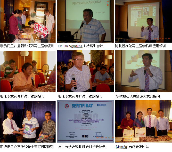 6、8月12日上午9時,由醫(yī)師學(xué)會主辦的Manado省級燒傷再生醫(yī)學(xué)臨床培訓(xùn)班(省級繼續(xù)教育項目,學(xué)分8分)在Aston Hotel酒店的會議室里舉辦,來自全省主要的4個城市的8家政府醫(yī)院和其它20多家私營醫(yī)院的89名臨床醫(yī)師、護士參加了這次培訓(xùn)會。培訓(xùn)會由Manado 總醫(yī)院燒傷整形外科主任Dr. Jan Ngantung主持,陳教授應(yīng)邀作了“燒傷再生醫(yī)學(xué)與療法在燒傷、創(chuàng)瘍疾病治療的臨床規(guī)范應(yīng)用”的培訓(xùn)演講,很受大家的歡迎,達(dá)到了較理想的培訓(xùn)效果。