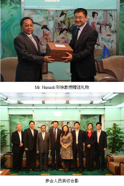 10月22日上午,美寶國際集團董事局主席徐榮祥教授在集團貴賓室親切會見Mr. Hamadi一行將本次訪問活動推向了高潮。徐教授表示美寶印尼市場一直以來都是美寶集團最為關注的市場區(qū)域之一,對雙方所達成的五年規(guī)劃、新產品發(fā)展計劃及新的合作模式表示祝賀,并向客人全面通報了近年來美寶在癌癥研究及再生會所等方面取得的重大進展,并提出印尼將是美寶人體再生復原俱樂部全球推廣計劃的基地之一。Mr. Hamadi首先對于徐教授的介紹表示感謝,對于美寶在癌癥研究方面取得的成就表示祝賀,同時對于徐教授提出的計劃連聲表示贊同,希望回到印尼后能夠盡快啟動這項計劃,希望自己盡快在印尼享受到人體再生復原技術帶來的養(yǎng)生效果。
