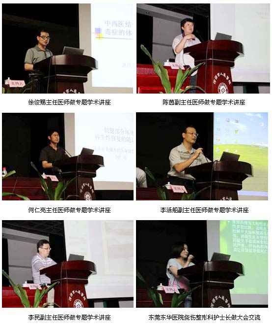 王洪生研究員首先以“燒傷皮膚原位再生復(fù)原技術(shù)在重度以上燒傷系統(tǒng)治療的要點(diǎn)”為題進(jìn)行了專題學(xué)術(shù)講座;隨后,唐乾利教授講解了“皮膚潰瘍創(chuàng)面處理的中西醫(yī)基礎(chǔ)與臨床研究近況”;王達(dá)利教授講授了“瘢痕疙瘩來(lái)源干細(xì)胞的生物學(xué)特性鑒定”;賀全勇教授講授了“燒傷感染的防治”;譚軍教授講授了“點(diǎn)陣激光治療增生性瘢痕”;張一鳴教授講授了“燒傷瘢痕的外科治療”; 省內(nèi)專家廣東省中西醫(yī)結(jié)合學(xué)會(huì)燒傷專業(yè)委會(huì)副主任委員、中山大學(xué)附屬五院燒傷整形科主任辛儉副主任醫(yī)師;廣東省中西醫(yī)結(jié)合學(xué)會(huì)燒傷專委會(huì)副主任委員、深圳陽(yáng)光醫(yī)院院長(zhǎng)張華彬主任醫(yī)師;廣東省中西醫(yī)結(jié)合學(xué)會(huì)燒傷專委會(huì)副主任委員、深圳市第六人民醫(yī)院梁智主任醫(yī)師;廣東省中西醫(yī)結(jié)合學(xué)會(huì)燒傷專委會(huì)副主任委員、廣東醫(yī)學(xué)院附屬惠州醫(yī)院(惠州市中心醫(yī)院)燒傷整形科主任徐俊賜主任醫(yī)師;廣東省中西醫(yī)結(jié)合學(xué)會(huì)燒傷專業(yè)委員會(huì)常委、深圳市龍崗中心醫(yī)院燒傷整形科主任陳茵副主任醫(yī)師;廣東省中西醫(yī)結(jié)合學(xué)會(huì)燒傷專業(yè)委員會(huì)委員、佛山南海人民醫(yī)院燒傷整形科主任李民副主任醫(yī)師;廣東省中西醫(yī)結(jié)合學(xué)會(huì)燒傷專業(yè)委員會(huì)常委兼秘書、中山黃圃人民醫(yī)院皮膚與燒傷創(chuàng)瘍科主任何仁亮主任醫(yī)師;廣東省中西醫(yī)結(jié)合學(xué)會(huì)燒傷專業(yè)委員會(huì)常委、開(kāi)平市婦幼保健院院長(zhǎng)李活船副主任醫(yī)師分別以“小兒重度燒傷治療”、“皮膚擴(kuò)張技術(shù)在燒傷瘢痕中的運(yùn)用”、“皮膚圓錐體結(jié)構(gòu)的病理學(xué)觀察”、“皮膚微粒皮種植修復(fù)大面積燒傷創(chuàng)面”、“中西醫(yī)治療燒傷膿毒癥”為題進(jìn)行了專題講座。在學(xué)術(shù)講座中來(lái)自國(guó)內(nèi)各省的專家利用大量詳實(shí)的圖片資料,重點(diǎn)向與會(huì)的專家、學(xué)者和醫(yī)護(hù)人員講述了燒傷皮膚原位再生復(fù)原醫(yī)療技術(shù)等中西醫(yī)結(jié)合方法在特重度燒傷并發(fā)癥及增生性瘢痕防治方面的進(jìn)展,由于學(xué)術(shù)講座重點(diǎn)突出、內(nèi)容豐富、貼近臨床,方法簡(jiǎn)便實(shí)用、臨床效果顯著,與會(huì)代表反映強(qiáng)烈。學(xué)習(xí)班結(jié)束后,學(xué)員們進(jìn)行了廣泛而深入地交流。