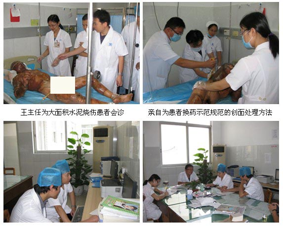 在培訓(xùn)基地揭牌儀式后,王主任在燒傷外科余暢主任的陪同下深入燒傷病房為該例大面積燒傷患者會診?;颊呤?011年8月30日早上7點該醫(yī)院外三科收治的一名水泥全身燒傷總面積達80%TBAS(深I(lǐng)I度~淺III度)的成人大面積深度燒傷。我主任在進行認真查房問診之后,指導(dǎo)該醫(yī)院燒傷外科的醫(yī)護人員應(yīng)用規(guī)范的燒傷皮膚原位再生復(fù)原技術(shù)救治病人,并與余暢主任及燒傷科醫(yī)生一起制定了詳細治療方案。