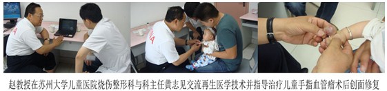 【1】7月18日趙教授在蘇州大學兒童醫(yī)院燒傷整形科與科主任黃志見交流再生醫(yī)學技術(shù)治療兒童手指血管瘤術(shù)后創(chuàng)面修復新技術(shù)。