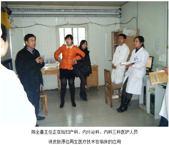 陳全喜主任在培訓(xùn)中強(qiáng)調(diào)說,人體皮膚原位再生醫(yī)療技術(shù)是中國(guó)生命科學(xué)家徐榮祥教授創(chuàng)立的,皮膚原位再生醫(yī)療技術(shù)的原理是讓創(chuàng)面立體式暴露在一個(gè)生理濕潤(rùn)環(huán)境內(nèi),自動(dòng)液化排除壞死皮膚,保護(hù)殘存皮膚細(xì)胞再生復(fù)原創(chuàng)面。并就皮膚原位再生醫(yī)療技術(shù)實(shí)現(xiàn)皮膚原位再生修復(fù)的原理進(jìn)行了詳細(xì)的講解。