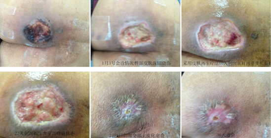 2014年深秋一名來(lái)自太原北部郊區(qū)的農(nóng)民患者,身患嚴(yán)重的腰椎間盤(pán)突出癥狀,給生活勞動(dòng)帶來(lái)諸多不便。經(jīng)醫(yī)院診斷,確診后腰椎管狹窄,腰椎第4、5間盤(pán)突出,經(jīng)醫(yī)患溝通后同意行①椎間盤(pán)射頻熱凝術(shù)。②椎間盤(pán)開(kāi)放手術(shù)加鋼板手術(shù)。術(shù)后發(fā)生左下肢去神經(jīng)皮膚癥狀(無(wú)疼痛感覺(jué))科室采用綜合醫(yī)診,包括針灸按摩等,12月下旬,行艾灸針灸時(shí),因艾卷脫落,將臀部皮膚深度燒傷(深Ⅲ°)。2015年元月3日,北京燒傷創(chuàng)瘍研究所副所長(zhǎng)趙瑞慶教授應(yīng)邀前往該院進(jìn)行會(huì)診,在該院頸椎疼痛科醫(yī)務(wù)人員的積極配合下,及時(shí)清除焦痂樣深部壞死組織,局部用藥改用徐榮祥教授創(chuàng)立的燒傷創(chuàng)瘍?cè)偕t(yī)學(xué)與療法,10天后創(chuàng)面發(fā)生了可喜的變化。壞死組織清理液化完畢,新生的肉芽開(kāi)始生長(zhǎng)。25天后肉芽生長(zhǎng)達(dá)到高峰值狀態(tài),將創(chuàng)口完全填充豐滿(mǎn)。36天創(chuàng)面完全封閉。春節(jié)后趙教授隨訪病人時(shí),患者非常激動(dòng)地說(shuō)到:感謝趙教授多次來(lái)院給我看病,我的傷口采用新方法治療,中間沒(méi)有發(fā)生感染,一個(gè)多月就好嘞,我太高興了!
