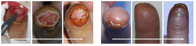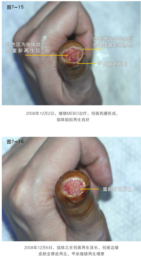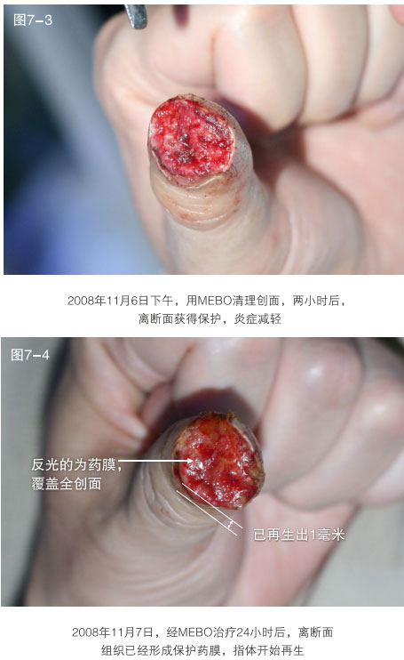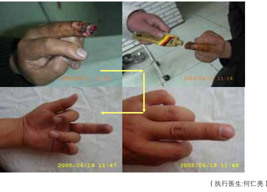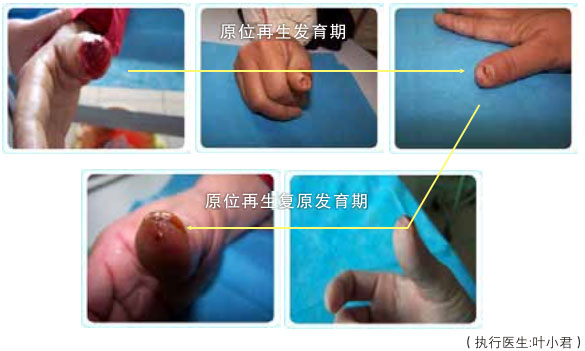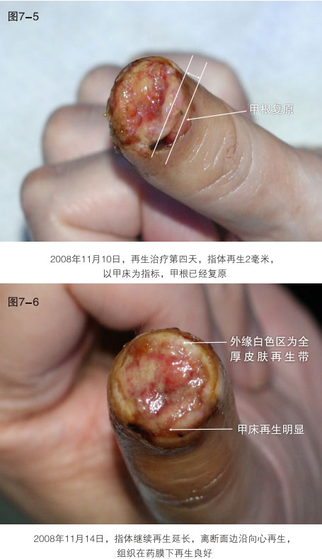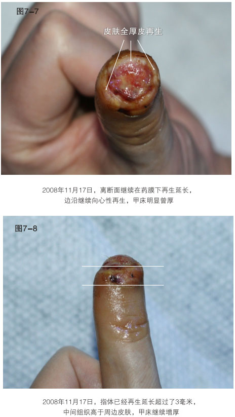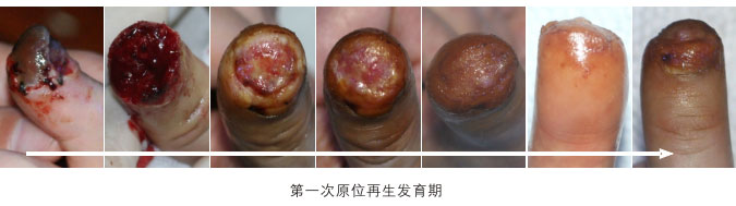臨床應(yīng)用資料為手指末節(jié)斷指再生,斷指系指指體離斷性損傷,包括指體的骨骼、肌肉、神經(jīng)、血管、軟組織、皮膚全部組織器官的離斷缺如,這種損傷在外科學(xué)治療上,目前采取的是顯微外科的接指技術(shù),但對(duì)于末節(jié)離斷,因?yàn)檠芎苄〔⑻幱谀┒?,難以將離斷的指體連接成活,無(wú)奈只能采取破壞性的離斷面封閉技術(shù),造成終身的指體殘廢。我們的原位再生復(fù)原技術(shù),已經(jīng)實(shí)現(xiàn)了臨床末節(jié)離斷損傷的原位再生復(fù)原。