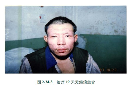3)深Ⅱ度深型創(chuàng)面25天內愈合,愈合皮膚表面粗糙,皮膚附件毛孔粗大,毛發(fā)稀少,質地稍硬,留有色素沉著。