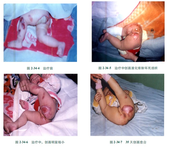 【病例2】患兒,女性,1歲,從火炕掉在鐵爐蓋上造成臀部左下肢深度燒傷,臀部創(chuàng)面呈瓷白色,為典型深Ⅲ度創(chuàng)面,全程應用MEBT/MEBO治療,35天痊愈。