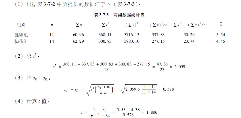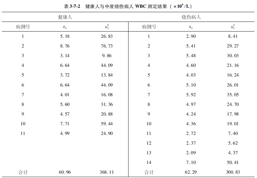 示例375某醫(yī)生研究中度燒傷病人和健康人的白細胞計數(shù),資料于下(表372)。問他們之間有無統(tǒng)計學差異?