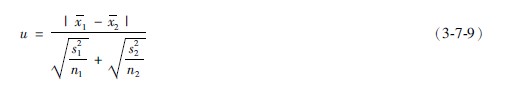 當兩個樣本數(shù)量較大時(即兩組樣本皆大于50),不必查t值表,可采用μ檢驗方法。其公式為: